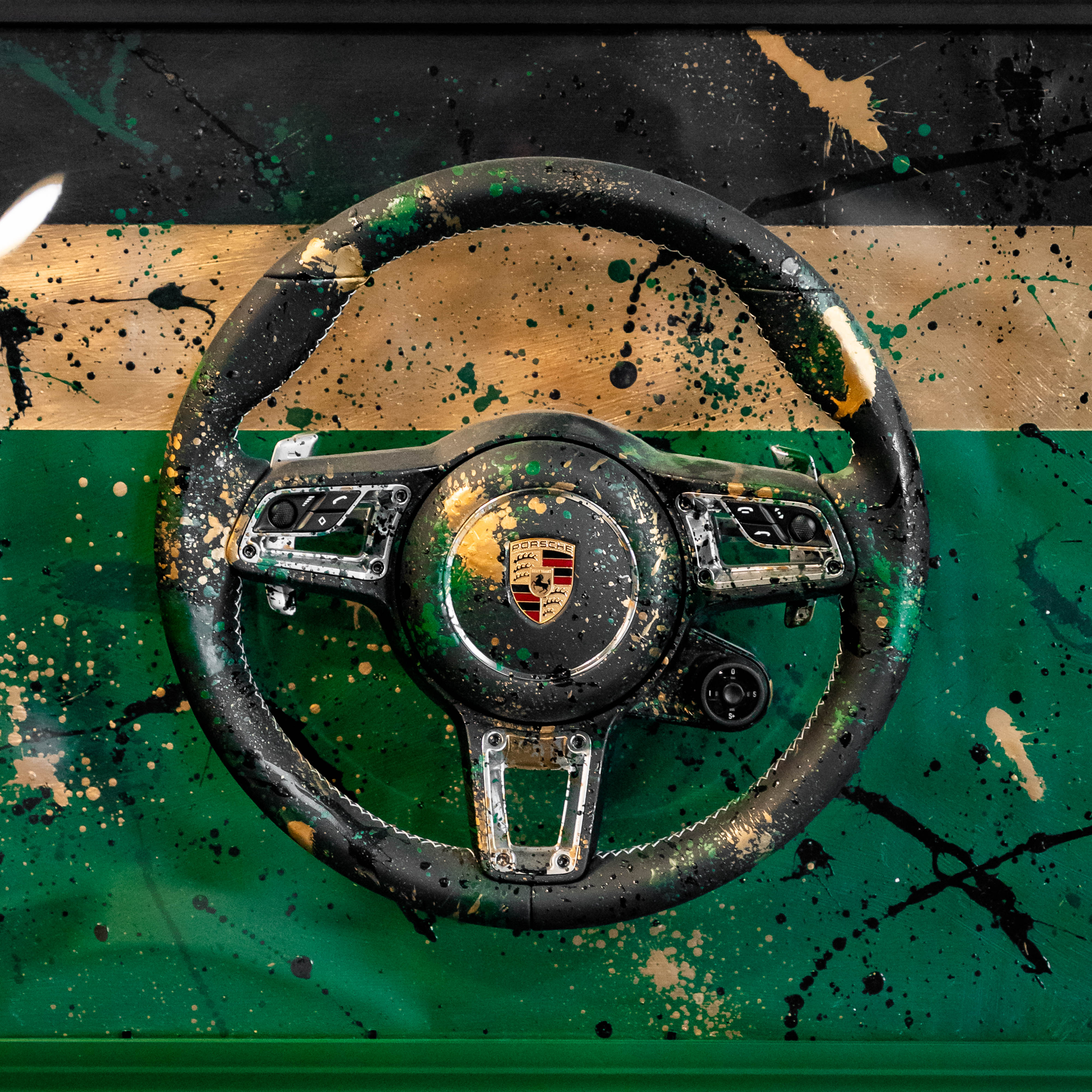 This is a handmade, one-of-one art piece created by Nocturnal Arts, featuring an authentic Porsche steering wheel permanently fused into a custom, hand-painted canvas. Finished in a British Racing Green and gold splatter, the piece blends motorsport heritage with modern street art.